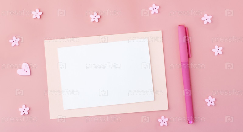 Цветные пустые листы пастельных тонов на розовом фоне рядом с ручкой, рядом с романтическими пуговицами в виде цветов и сердечек. Копировать пространство