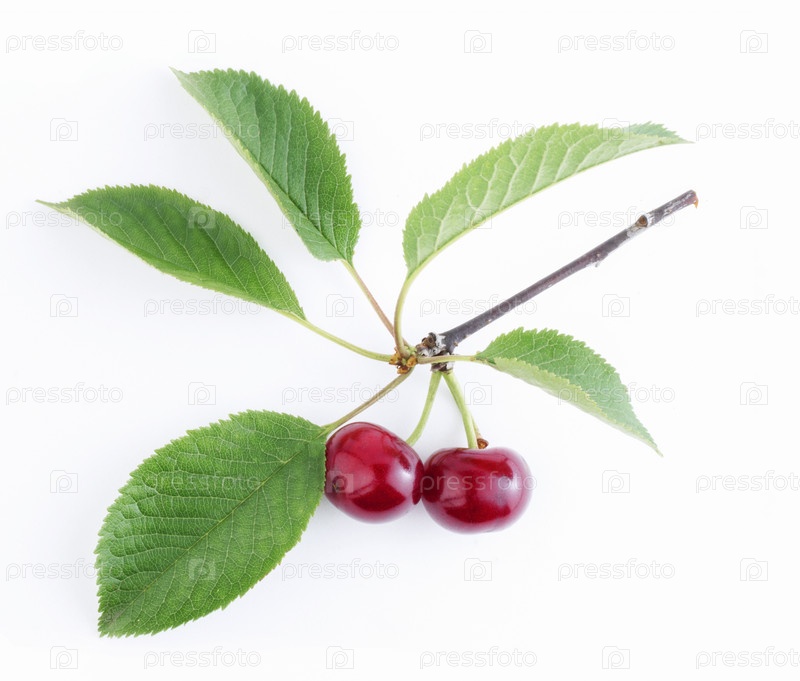 Спелые вишни на ветке с листьями, изолированными на белом фоне. Копировать пространство