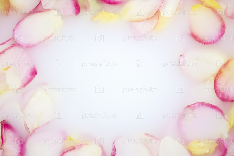 Розовые лепестки роз в целебной розовой воде с молоком. Молочная вода с лепестками роз. Спа-салон красоты и оздоровительные процедуры с лепестками цветов в ванне с молоком. Рамка. Скопируйте пространство. Плоская укладка