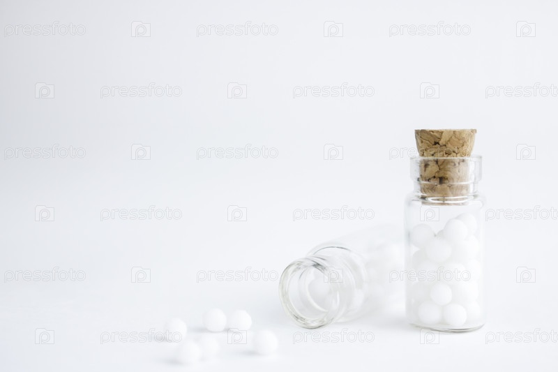 Гомеопатические глобулы и стеклянная бутылка на белом фоне. Травы альтернативной гомеопатии, лечение и таблетки. Скопируйте пространство