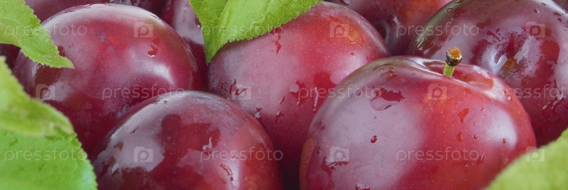 Свежие сливы с листьями и каплями воды, макрофото. Текстурный фон из свежих красных слив. Баннер. Панорамный фон. Скопируйте пространство