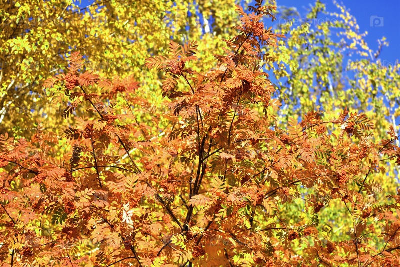 Красочные листья и ягоды рябины в осеннем парке