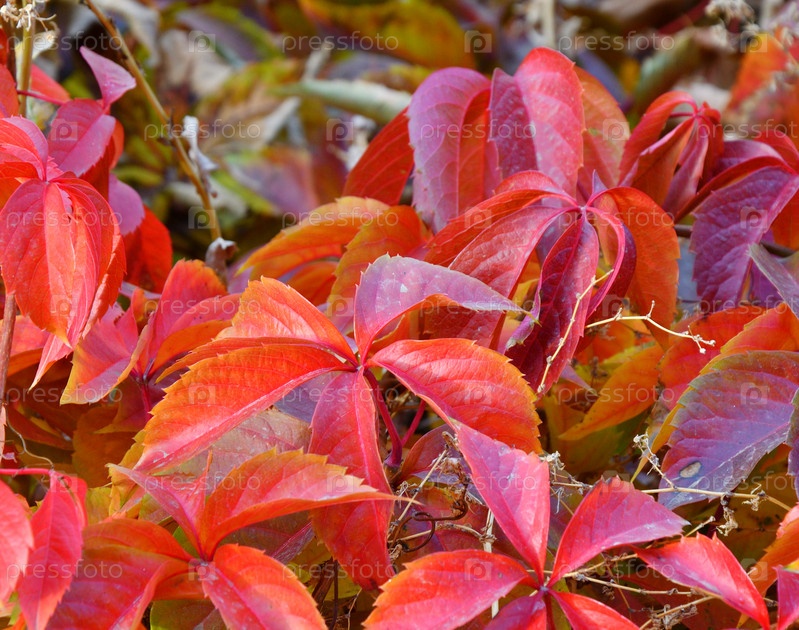 Разноцветные листья дикого или девственного винограда (лат. Parthenocissus) осенью