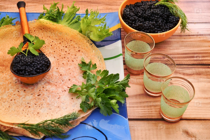 Блины с черной икрой, приготовленные на Масленицу