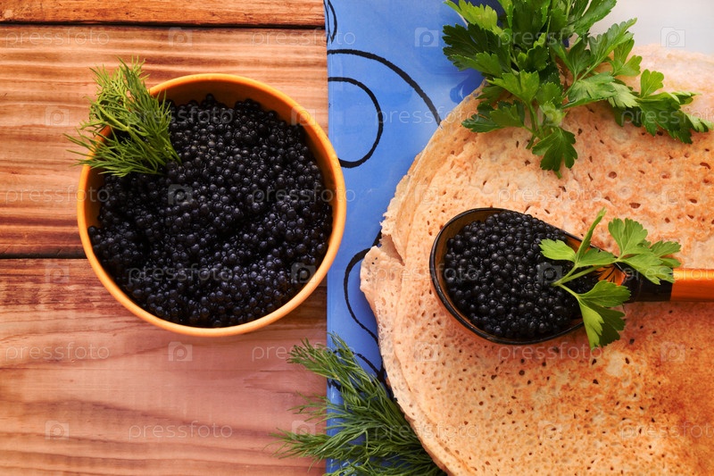 Блины с черной икрой, приготовленные на Масленицу