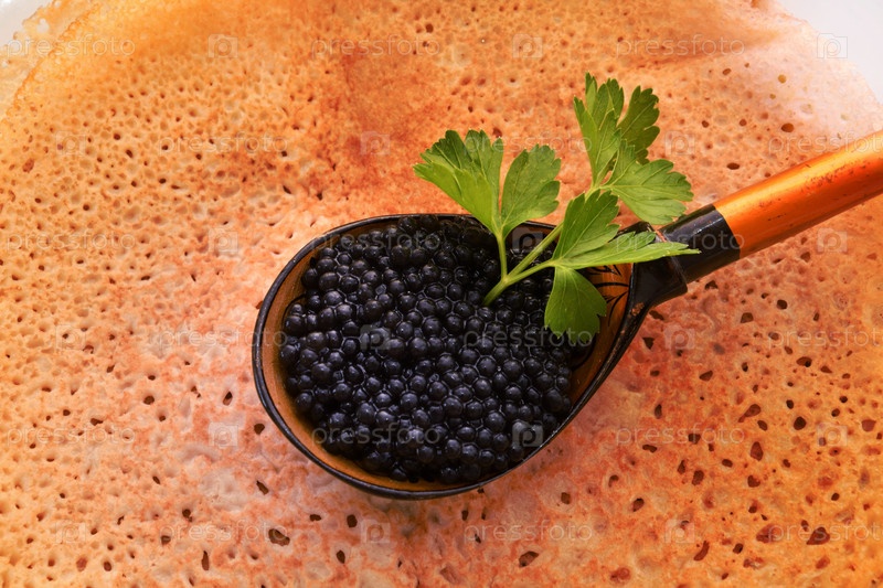 Блины с черной икрой, приготовленные на Масленицу