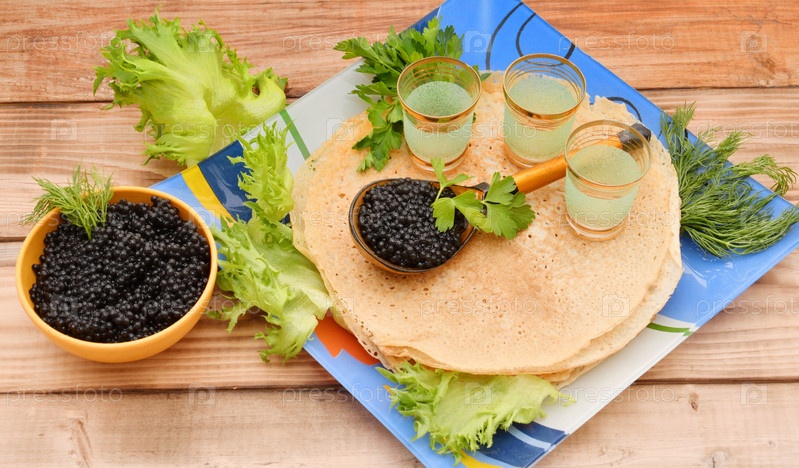 Блины с черной икрой, приготовленные на Масленицу
