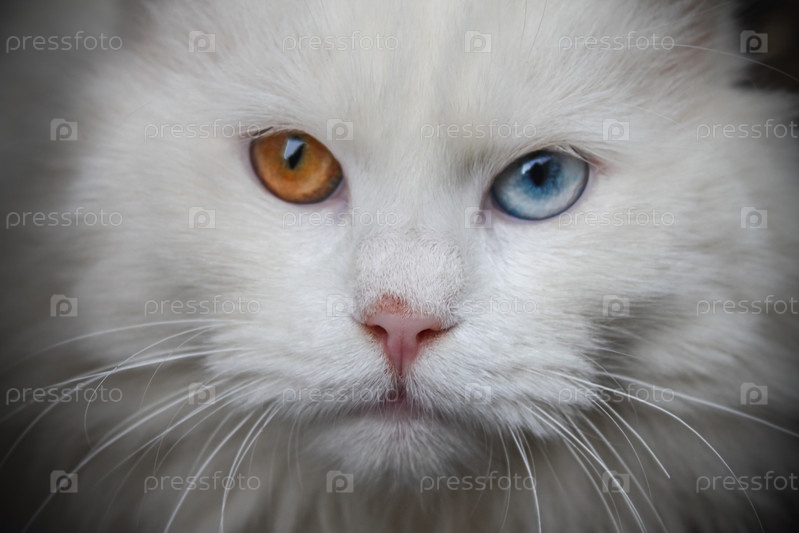 Чистый домашний белый кот с выразительными разноцветными глазами крупным планом