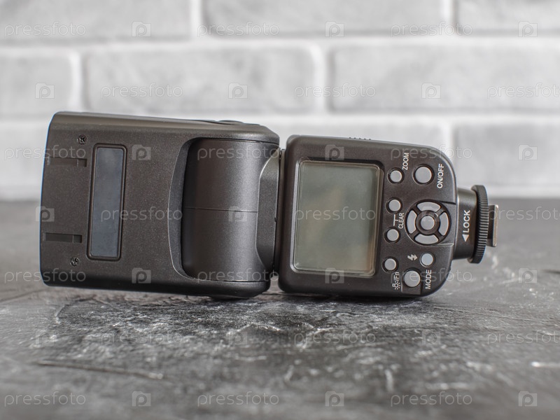 Вспышка камеры лежит на черном фоне с дисплеем в рамке