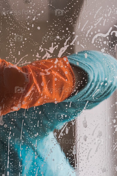 Через оконное стекло видна оранжевая резиновая перчатка, моющая окно мыльной пеной