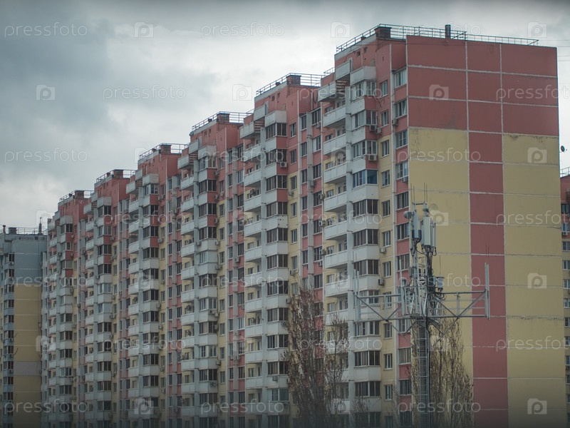 Многоэтажный панельный дом из железобетона. Типовая городская застройка для селитебных территорий России