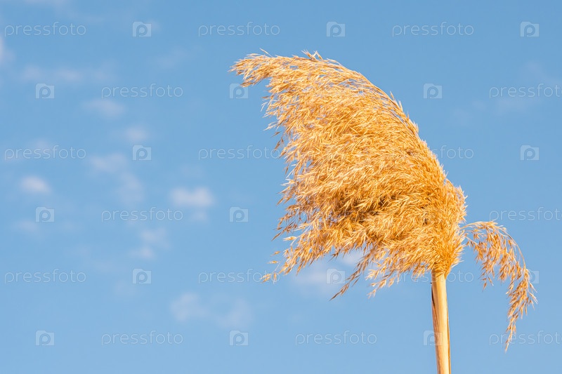 Пушистый высушенный тростник на ветру крупным планом. Синие облака на заднем плане
