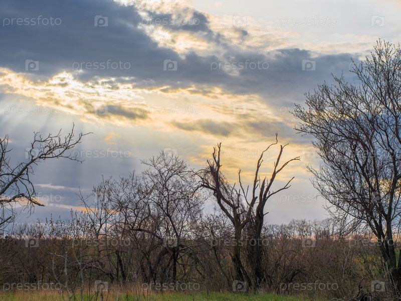 Лучи заходящего солнца пробиваются сквозь тучи. На переднем плане сухие ветки деревьев