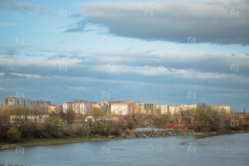 Река на фоне многоэтажек, голубое небо с серыми облаками