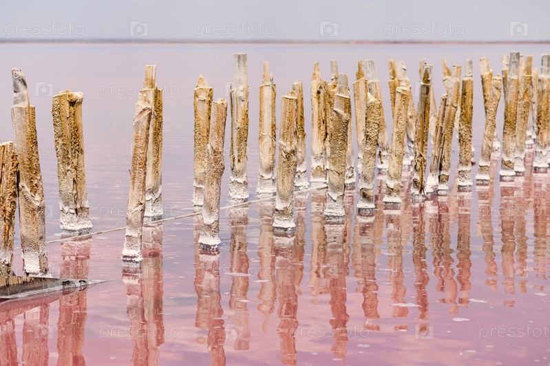 Много деревянных досок торчат из розового соленого озера. Соляные месторождения