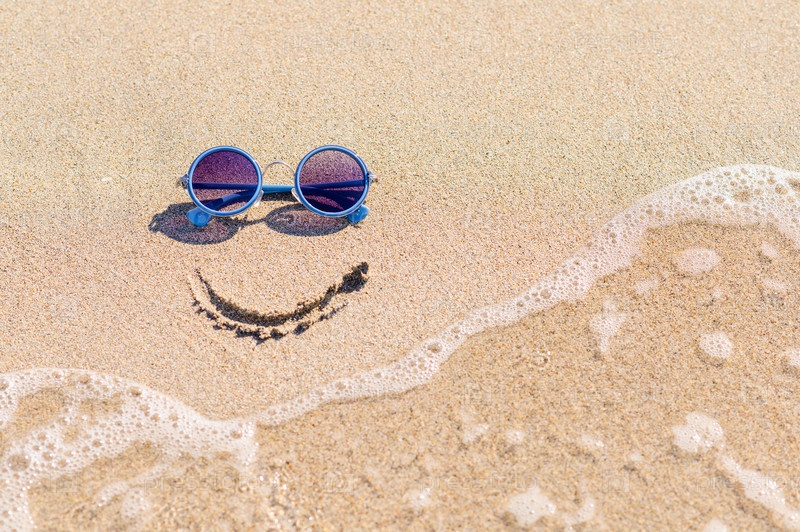 Символ хорошего настроения и позитивного морского отдыха. Улыбка нарисована на берегу моря рядом с солнцезащитными очками. Морская волна на песчаном берегу