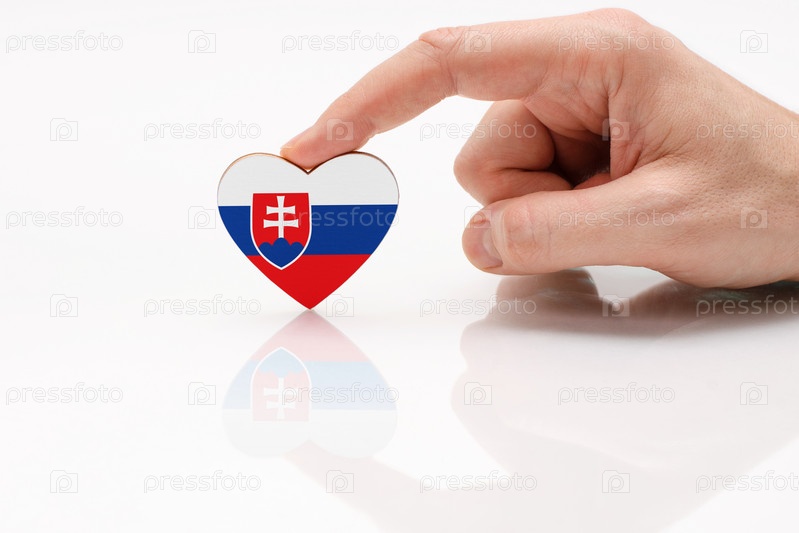 Флаг Словакии. Любите и уважайте Словакию. Мужская рука держит сердце в форме флага Словакии на поверхности белого стекла. Концепция словацкого патриотизма и гордости
