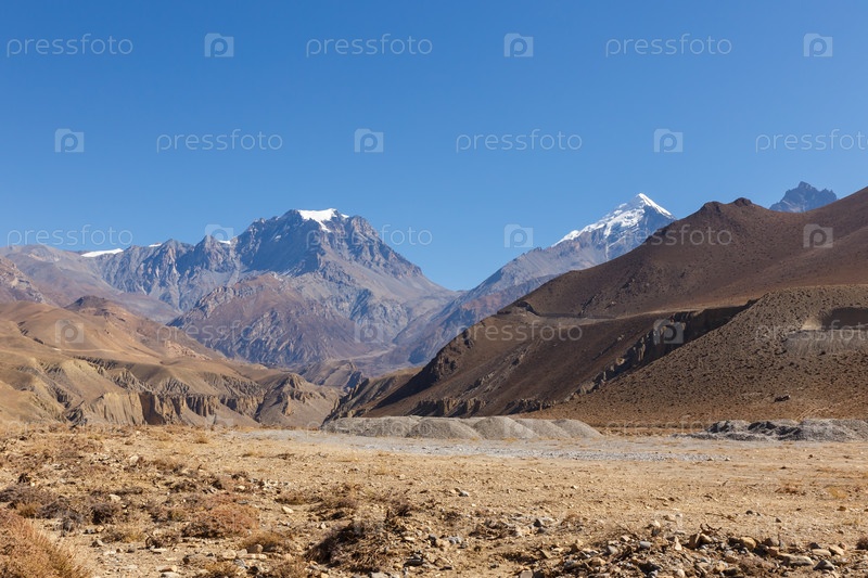 Горы Якваканг и Кхатунгканг. Перевал Торунг Ла. Вид из села Кагбени. Район Мустанг, Непал