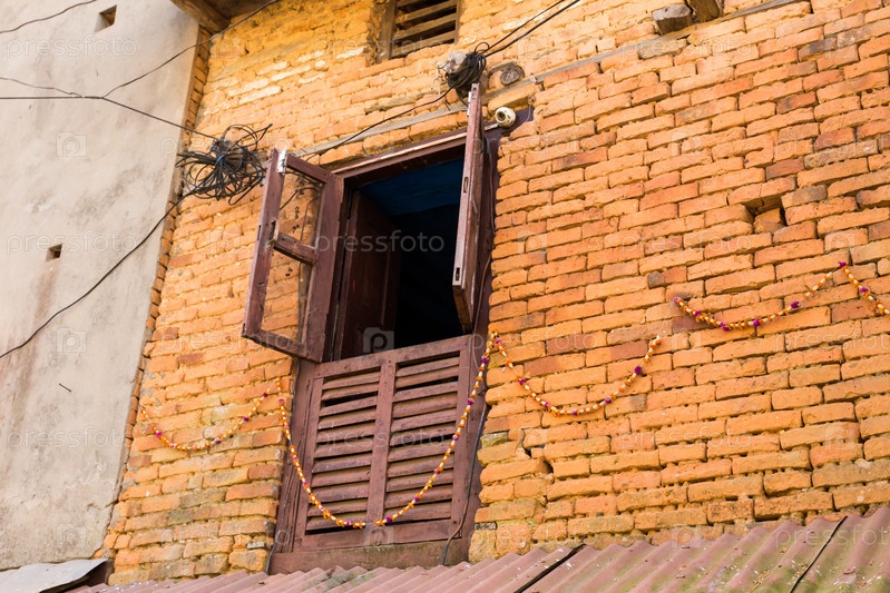 Открытое деревянное окно на кирпичной стене здания, Непал