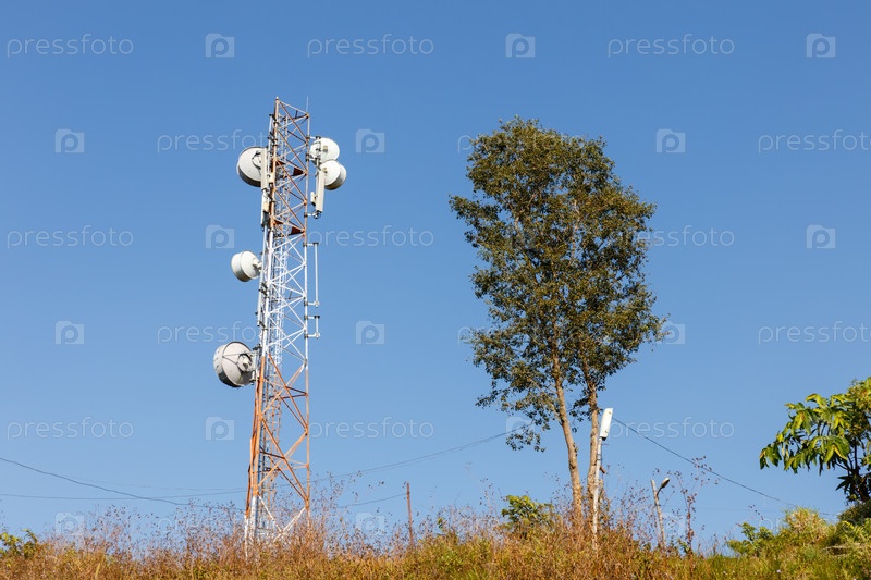 Сотовая вышка и дерево на фоне голубого неба