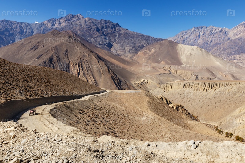 Муктинатх Садак. трактор едет по дороге в горах. гравийная дорога из Джомсома в Муктинатх в Гималаях