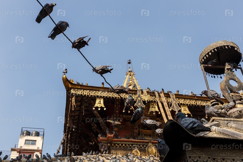 Голуби сидят на проводах возле храма в Катманду. Храм Сето Маххендранатх