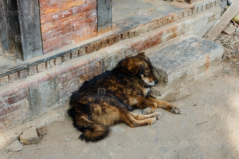 Собака лежит на крыльце у двери дома, Катманду, Непал