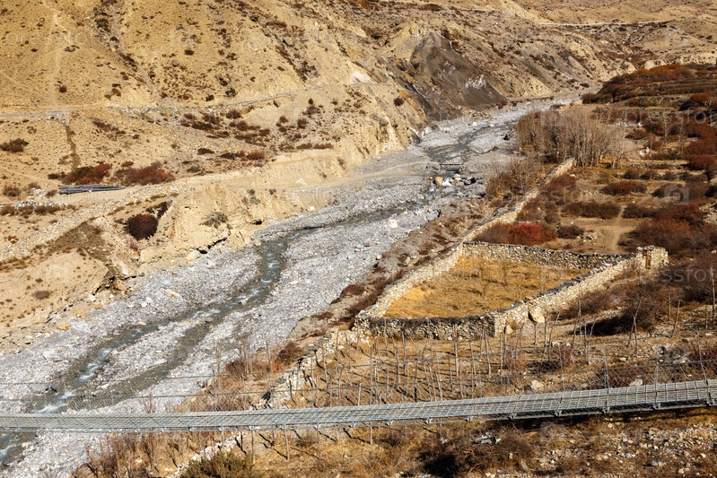 Горная река и подвесной мост в Гималаях, Нижний Мустанг, Непал