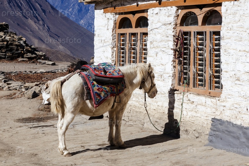 Белая лошадь с красивым седлом привязана к окну и стоит возле дома. Муктинатх, Непал