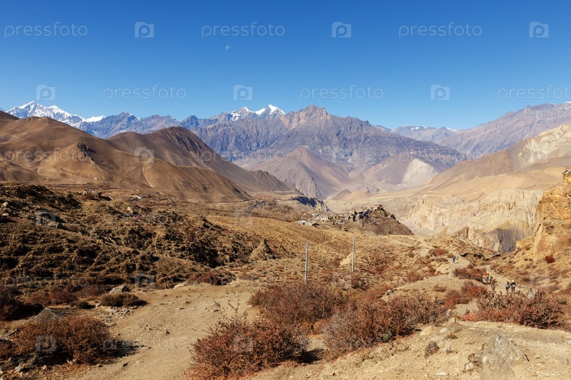Вид на деревню Джаркот. Район Мустанг, Непал. Дхаулагири и пик Тукуче на заднем плане