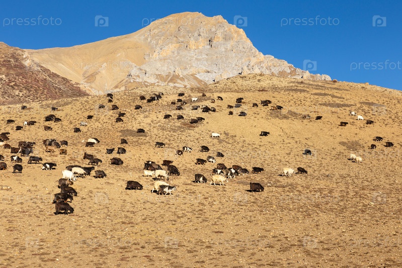 Стадо коз, пасущихся в Гималаях, заповедник Аннапурна