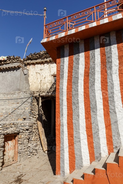 Полосатая стена дома. Вход в знаменитый красный домик в деревне Кагбени. Нижний Мустанг. Непал