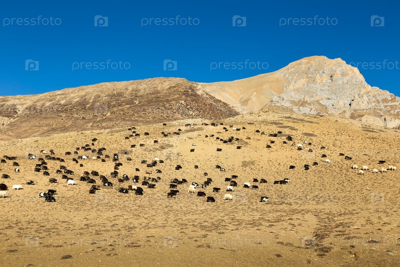 Стадо овец и коз, пасущихся в Гималаях, Непал