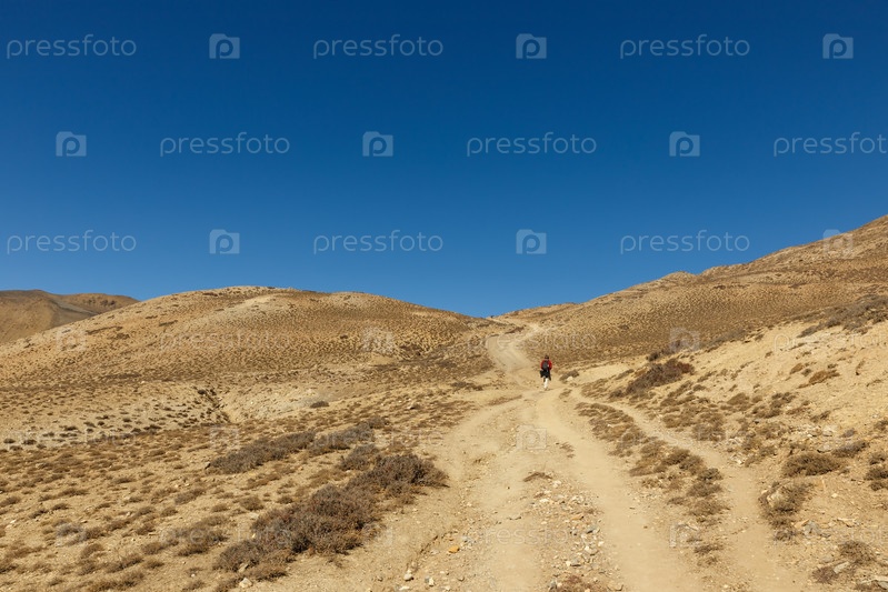 Турист идет по горной тропе в Гималаях. Горная тропа к перевалу Гью Ла, мустанг. Непал
