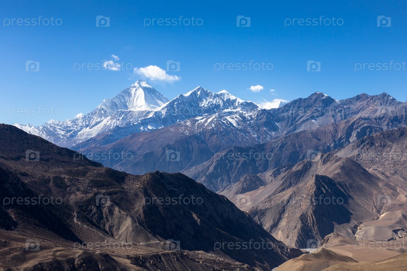 Вид на гору Дхаулагири и пик Тукуче с Муктинатха. Пейзаж по дороге из Муктинатха в Джомсом, Непал