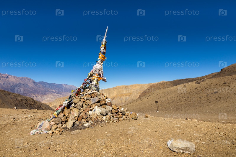 Традиционная тибетская куча и цветные флаги на перевале, Гималаи, Непал