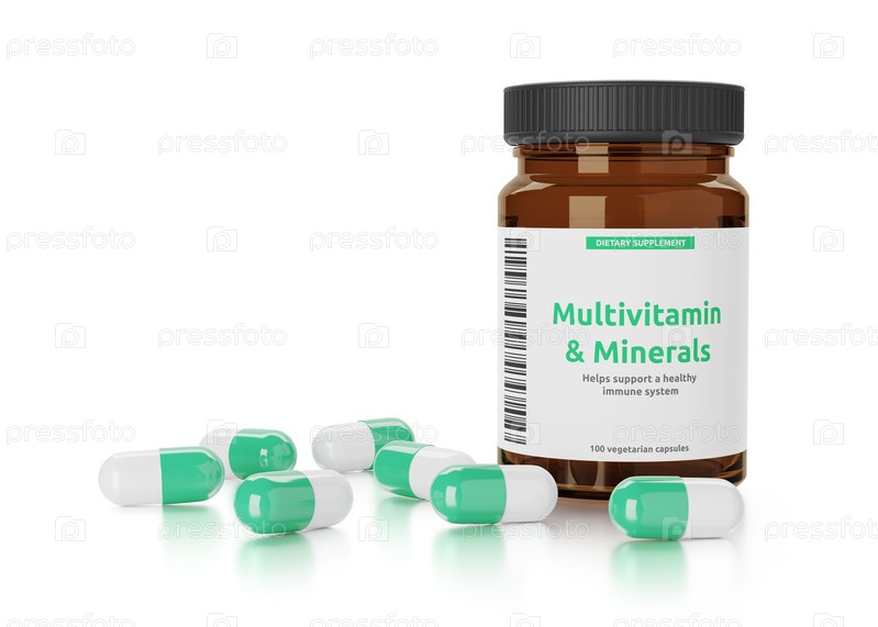 Мультивитамины и минералы в бутылке, изолированной на белом