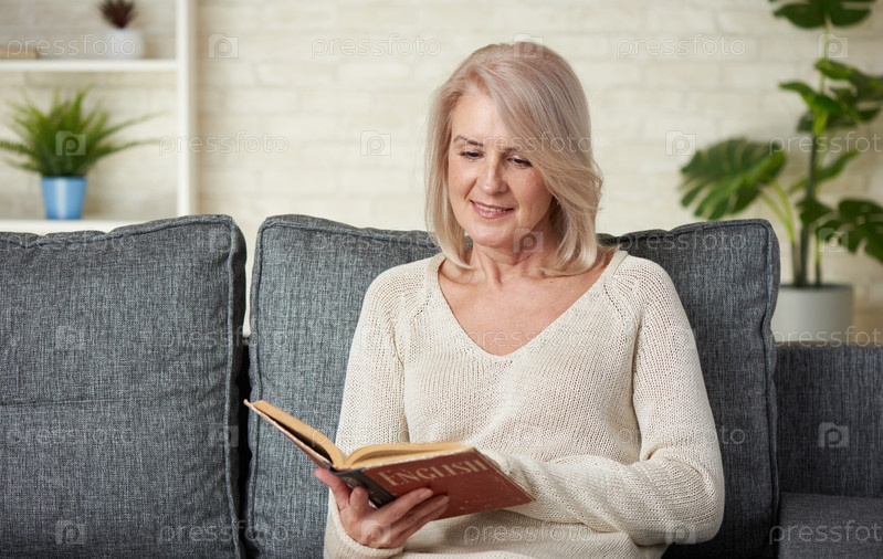 Веселая старушка с учебником изучает английский язык