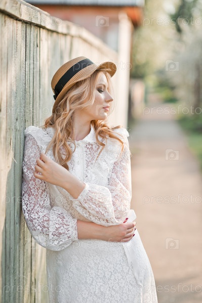Девушка в платье и шляпке на светлом переулке возле забора 2715