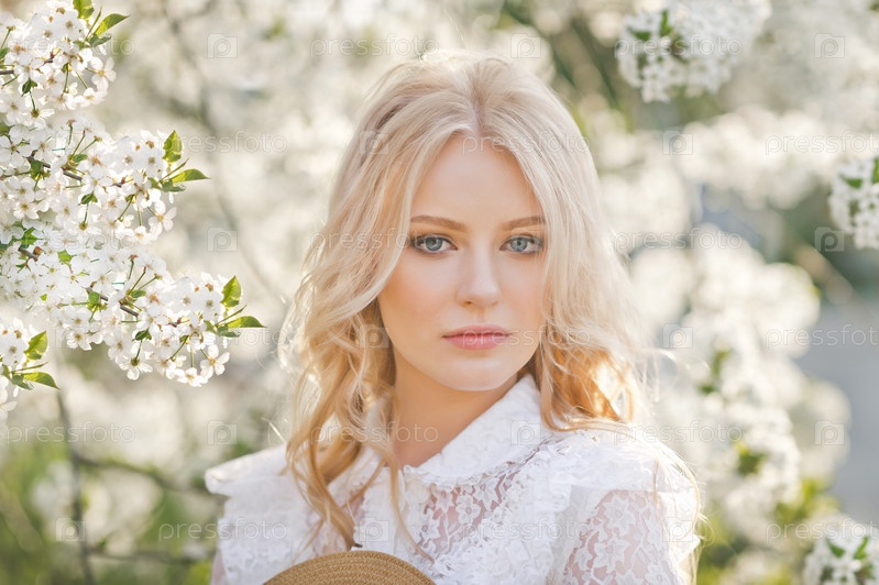 Блондинка среди цветущих деревьев на солнце