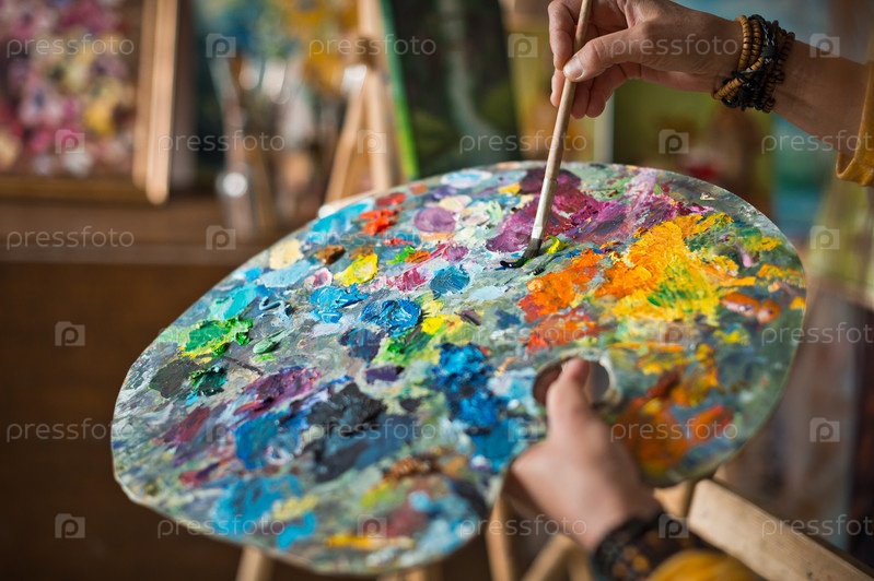 Художница держит в руке палитру и смешивает 2876 цветов