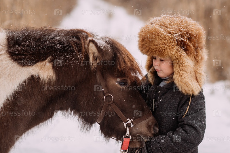 Прогулка по снежным дорожкам зимой среди камыша пони и ребенка