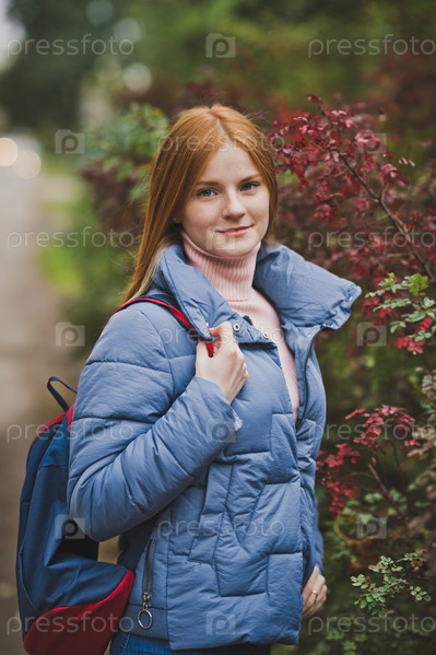 Рыжеволосая девушка гуляет среди красивых кустов 2741