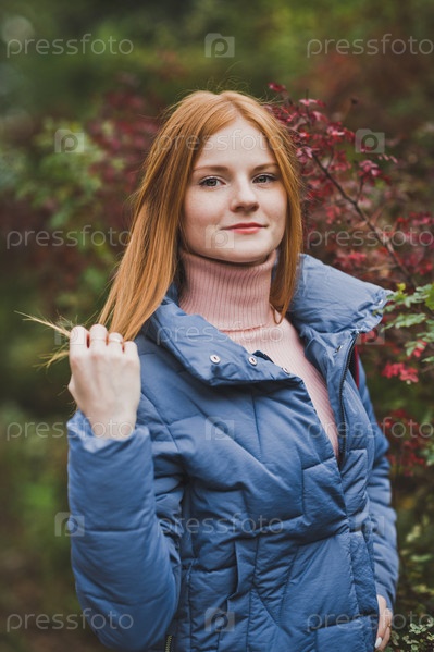 Рыжеволосая девушка гуляет среди красивых кустов 2742