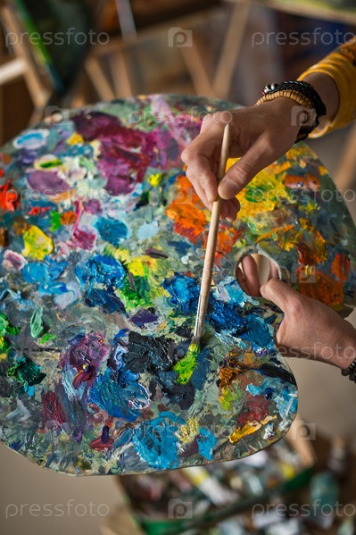 Художница держит в руке палитру и смешивает 2877 цветов