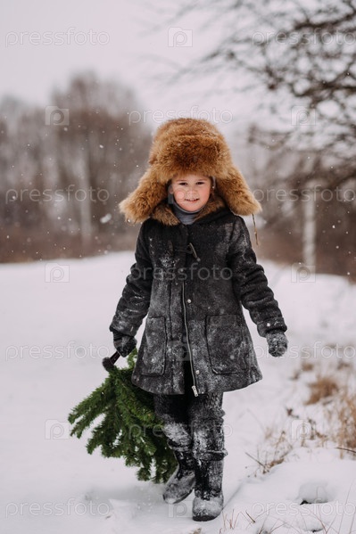 Ребенок получил елку в лесу, чтобы украсить дом для