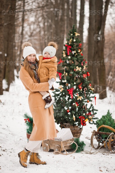 Семейное новогоднее фото с наряженной елкой на природе 3542
