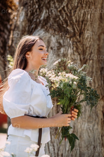 Прогулка радостной девушки с букетом ромашек в летнем парке 3561