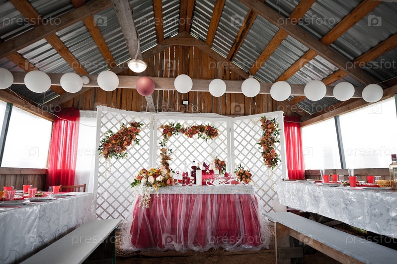 Место для молодоженов на празднике с фоном, украшенным флоу