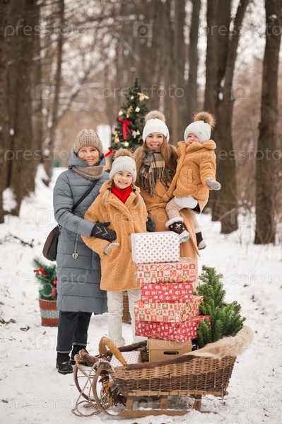 Семейное новогоднее фото с наряженной елкой на природе 3550